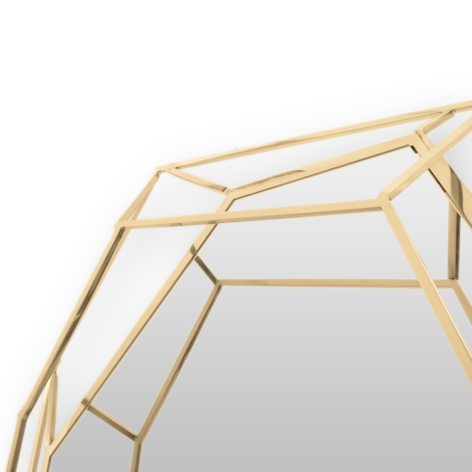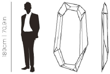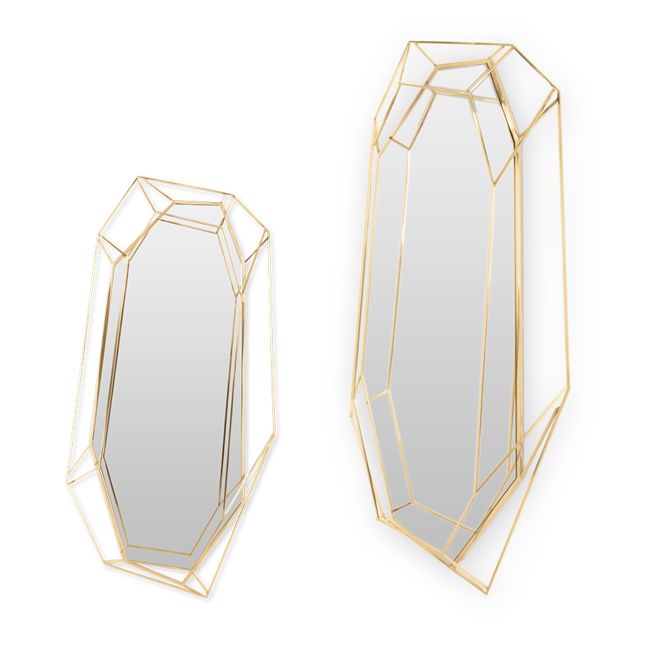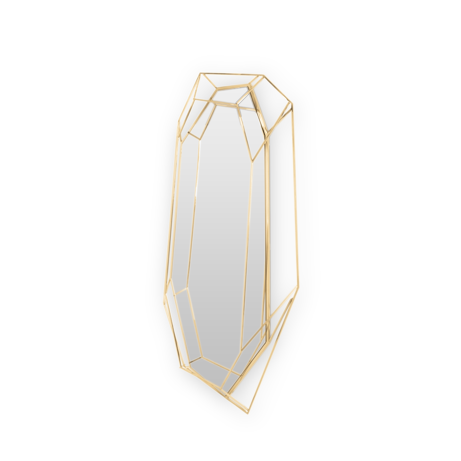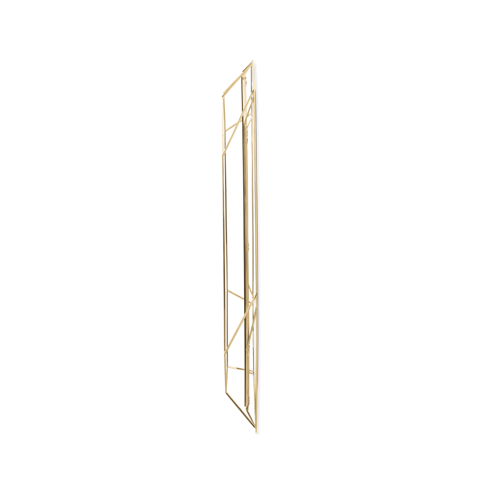 A full-length version of the diamond-shaped mirror. Crafted in a polished brass structure it produces a tall sleek design, merging geometry and design in the same object. This amazing piece will add a luxurious and rich element to any interior.