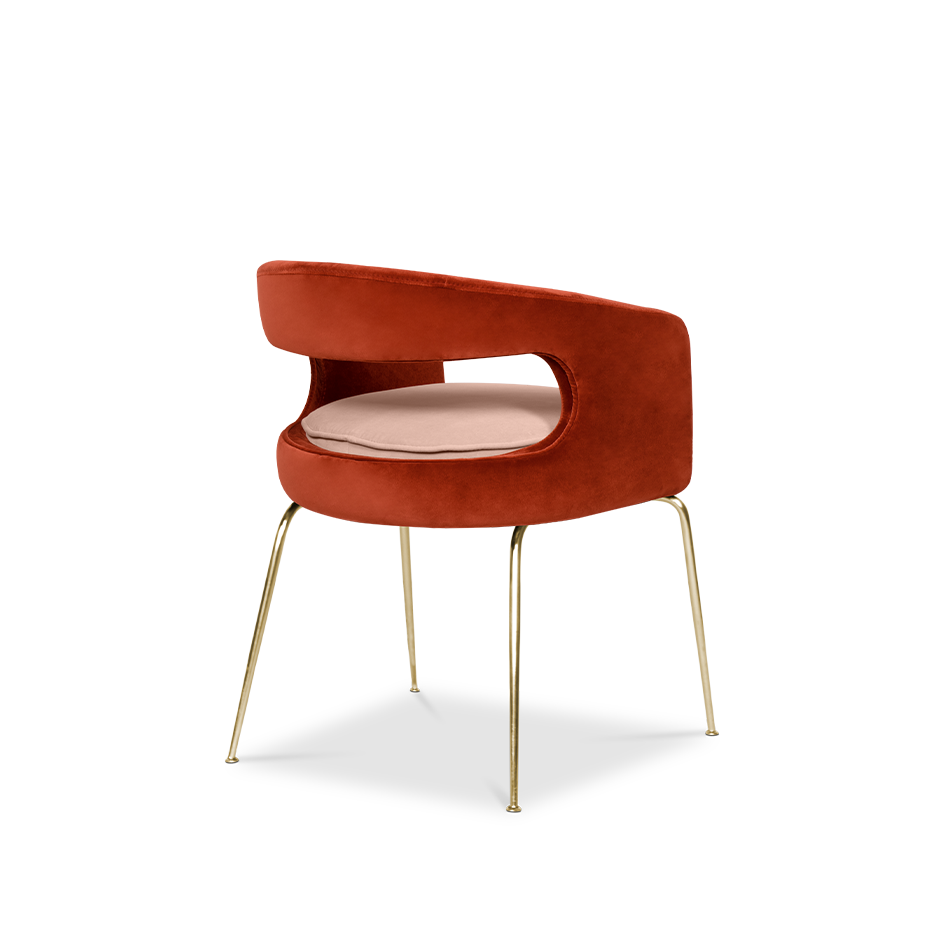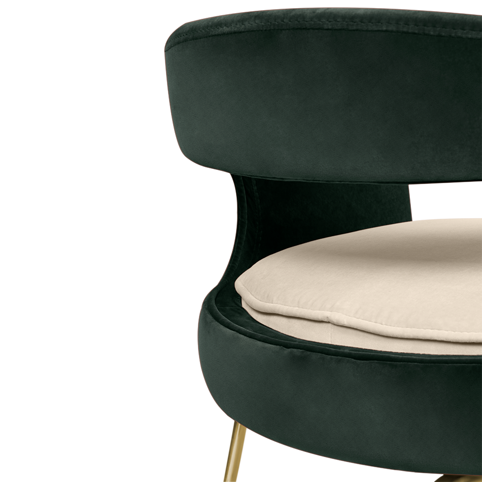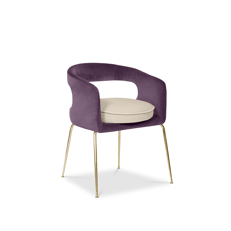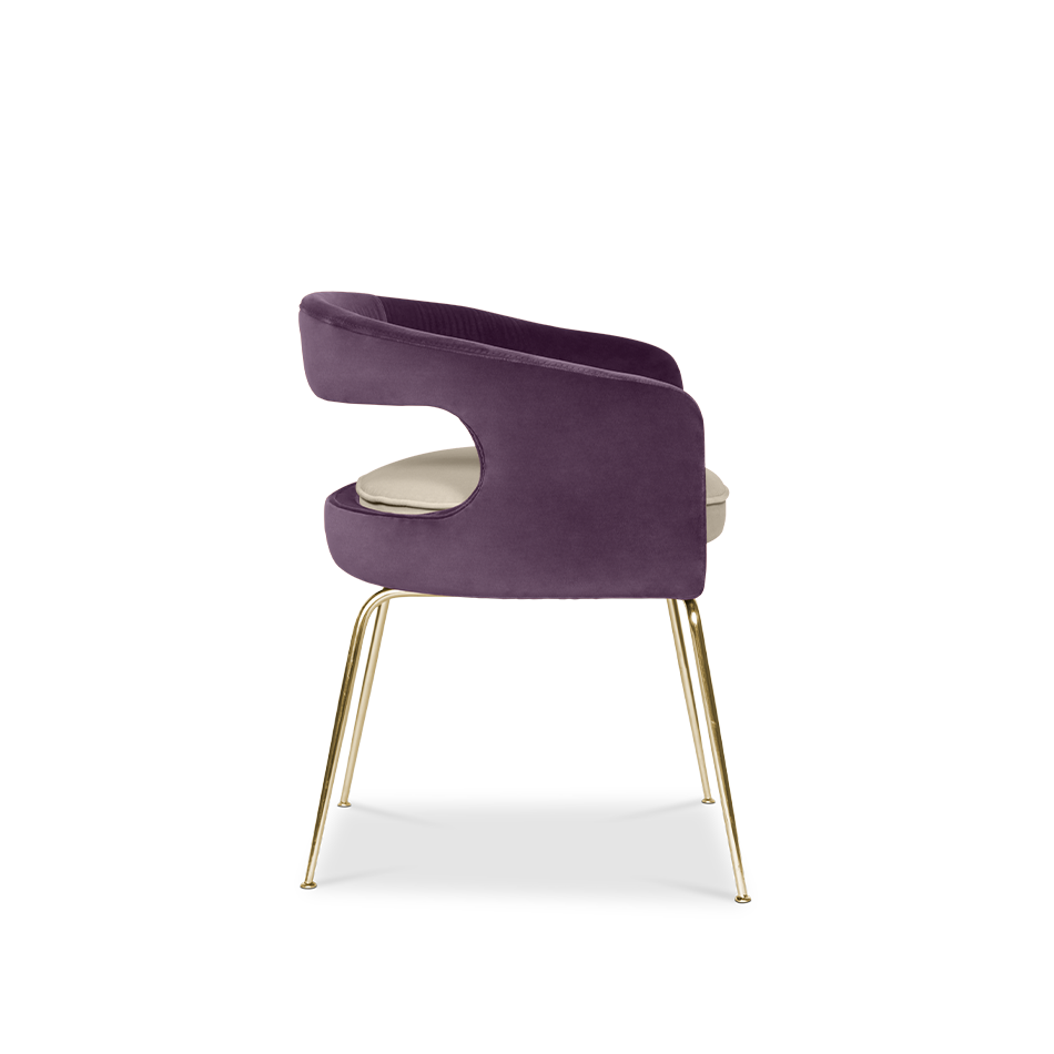 A fanciful dining chair full of luxurious features that will bring personality and uniqueness to your dining room. It is upholstered in velvet and has mixed tones both on the back and the round cushioned pad. Extremely sculptured, and it contrasts with the slim legs made of polished brass.