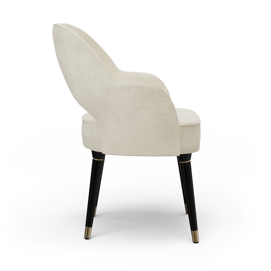 The Collins dining chair, now with armrests, is a harmonious blend of contemporary elegance and timeless comfort. Its plush velvet upholstery, available in a range of luxurious colors, invites you to linger over meals and conversations. The chair's distinctive silhouette, featuring gently curved armrests and tapered legs, adds a touch of sophistication to any dining space.
