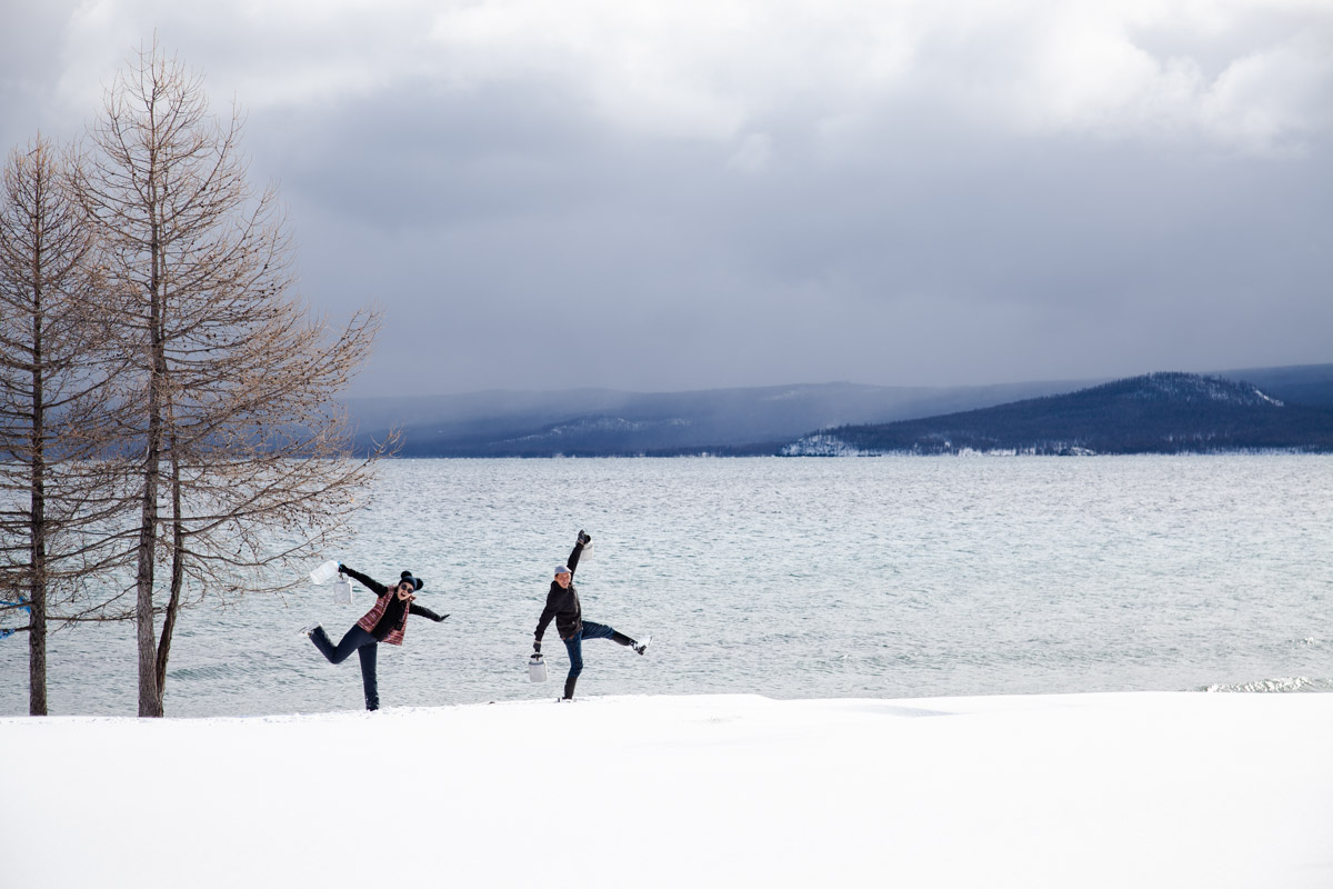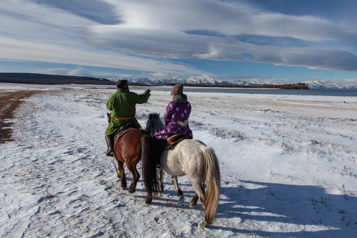 Luego nos mudamos al lado este del lago. Nos quedamos donde una encantadora familia nómade que tiene caballos y que nos llevó a recorrer el lago por la tarde. No había nadie así que teníamos todo el lago para nosotros. Una vez más con unos paisajes alucinantes. Una sensación de libertad total cuando montamos estos caballos medio salvajes a lo largo de los bosques y estepas nevadas. Suena cliché, lo sabemos, pero realmente no nos cansamos de repetir que los paisajes son increíbles.