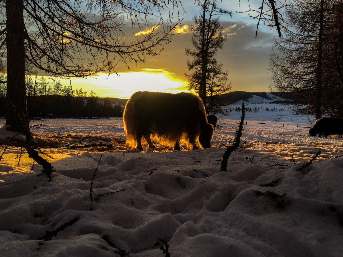 Pasamos toda la mañana en el ger, pues estaba nevando bien fuerte. Recién por la tarde el cielo se abrió y salió el sol así que salimos a dar un paseo por el bosque justo detrás del campamento. Después de una linda caminata entre arboles y hojas congeladas, tenemos que volver porque pronto caerá la noche.
