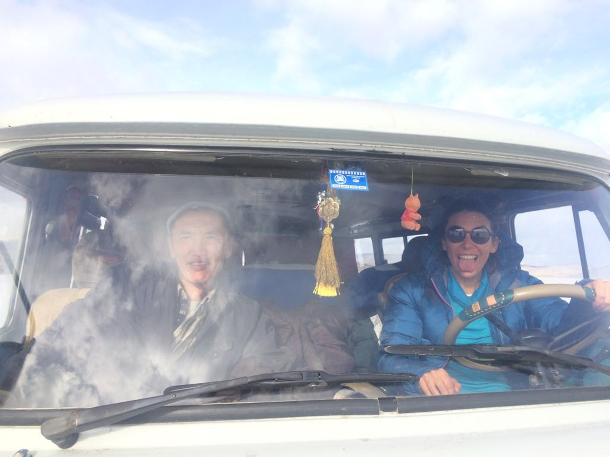 Con una caja de cambios caprichosa, una súper dirección asistida y pedales que llegan hasta la rodilla, este animal no es fácil de domar. Encima con los 20 cm de nieve, se hacia súper difícil mantenerte avanzando en línea recta porque tenias que mover el timón demasiado. Después de 15 minutos manejando tengo que admitir mis respetos por pilotos como Byamba pues conducir este vehículo en terrenos extremos y sin quedarse atollado requiere de un verdadero conocimiento y miles de kilómetros de experiencia. Así que mejor le devuelvo el volante a Byamba antes de estropearle el carro. Fiorella tampoco pudo resistirse a probar la manejada pero en 3 minutos casi destruye el auto, así que Byamba tuvo que invitarla a retirarse del volante.