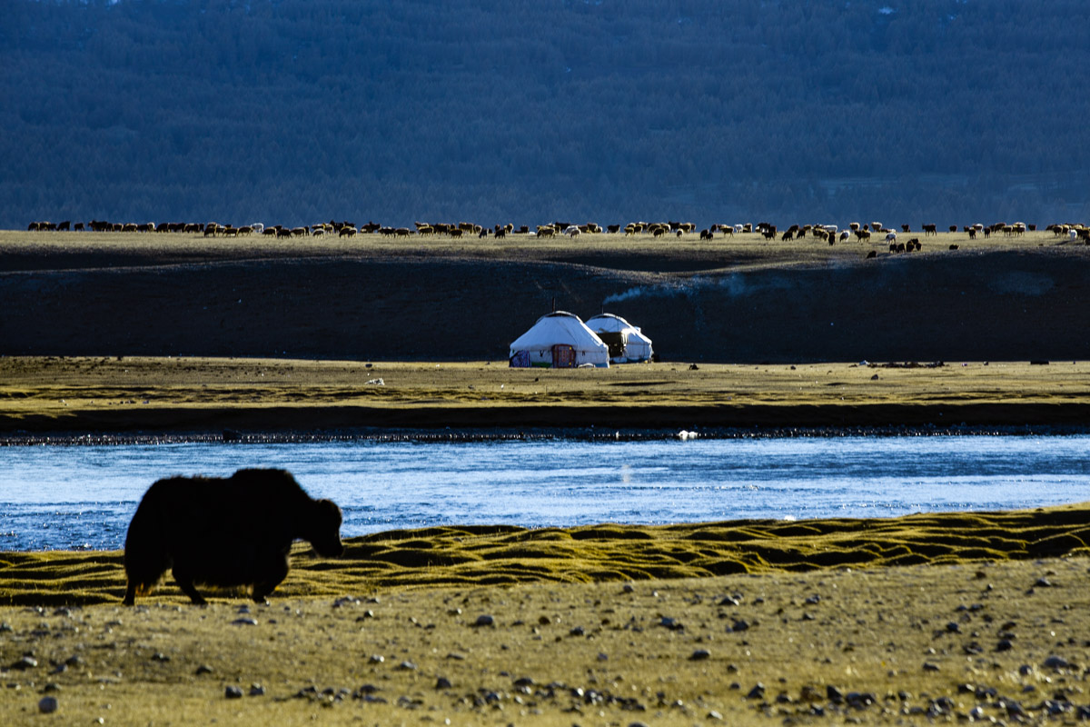Nous avons passé la première partie du voyage au pied des montagnes de l’Altaï, dans le parc national de Tavan Bogd, à environ 6 heures de route d’Ölgii. Des paysages grandioses de carte postale qui vous donnent un premier aperçu de l’immensité de la steppe mongolienne. Des cavaliers, des troupeaux un peu partout… vaches, chèvres, moutons, chevaux ou yacks et, cerise sur le gâteau, quelques chameaux sur des plateaux sans fin au milieux de sommets enneigés… magique !