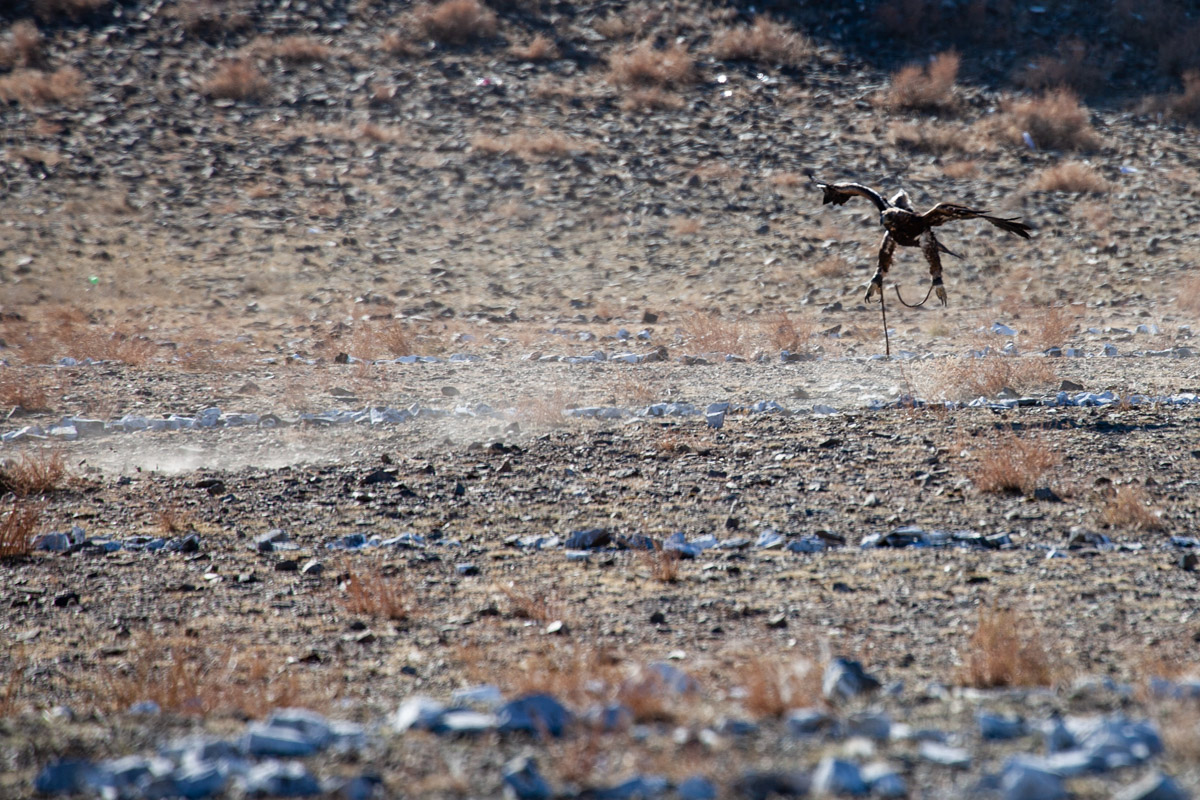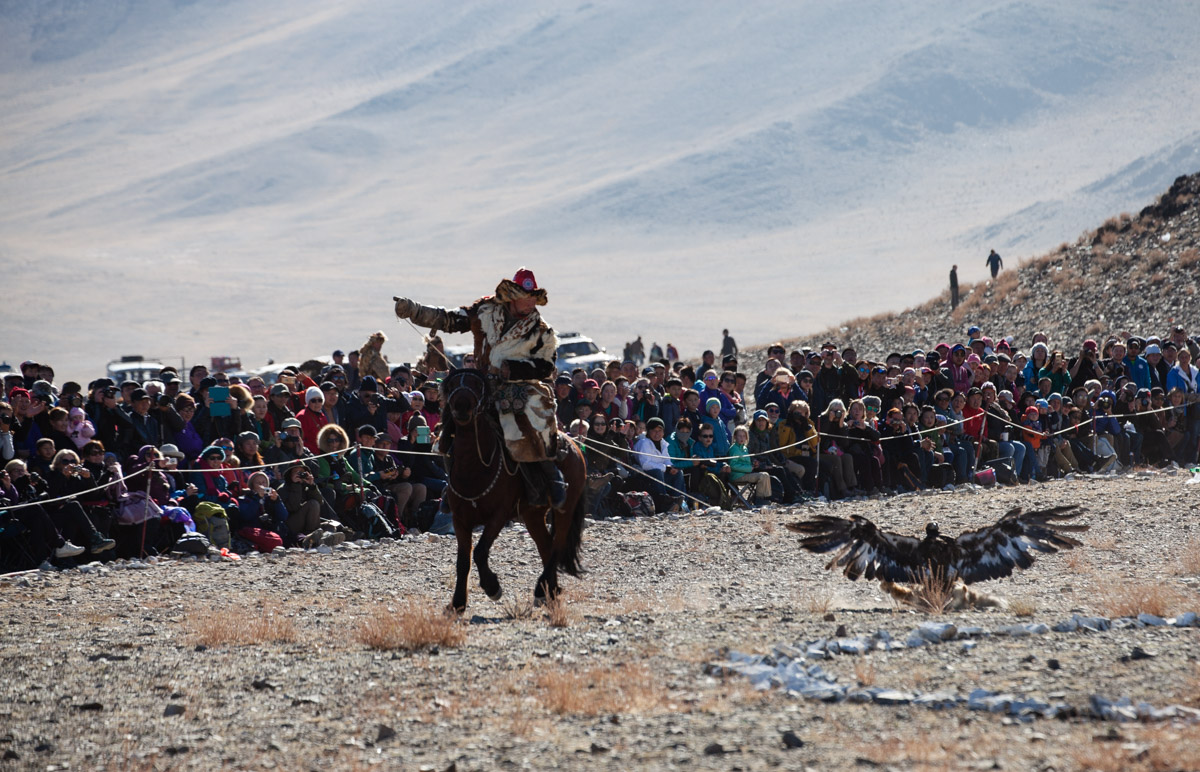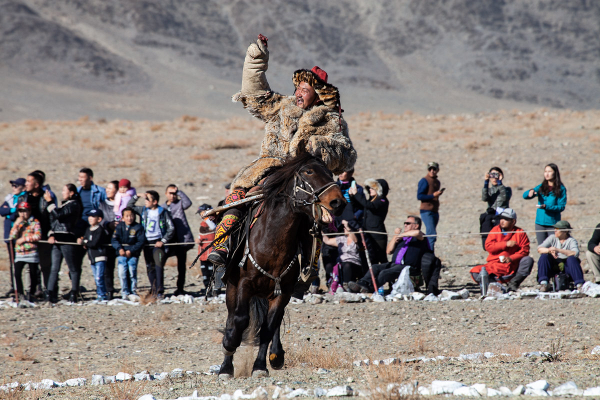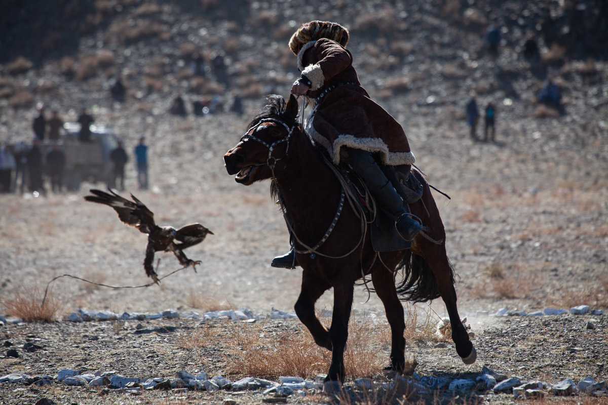 Autre point important, on met souvent en avant la tradition et le respect des animaux : les chasseurs, qui enlèvent le petit du nid quelques semaines après la naissance pour l’élever, prétendent qu’ils relâchent l’animal au bout de 5 années pour lui laisser profiter du reste de sa vie (les aigles peuvent vivre entre 20 et 35 ans dans la nature). Dans les faits, plusieurs sources nous ont affirmé qu’il était assez rare que les chasseurs relâchent leur aigle si rapidement. Pas forcément très « éthique » d’un point de vue occidental mais on peut malgré tout comprendre que l’investissement dans l’élevage et la réelle complicité créée avec l’animal puisse inciter à le garder beaucoup plus longtemps avec eux. Par ailleurs, de ce que l’on en a vu, les chasseurs ont un vrai respect pour leur animal et en prennent le plus grand soin ; au final, au delà du show du festival, plus que leurs chiens, leurs chèvres ou même leurs chevaux, l’aigle est un véritable « animal de compagnie » avec qui ils chassent (pour de vrai) une bonne partie de l’année.