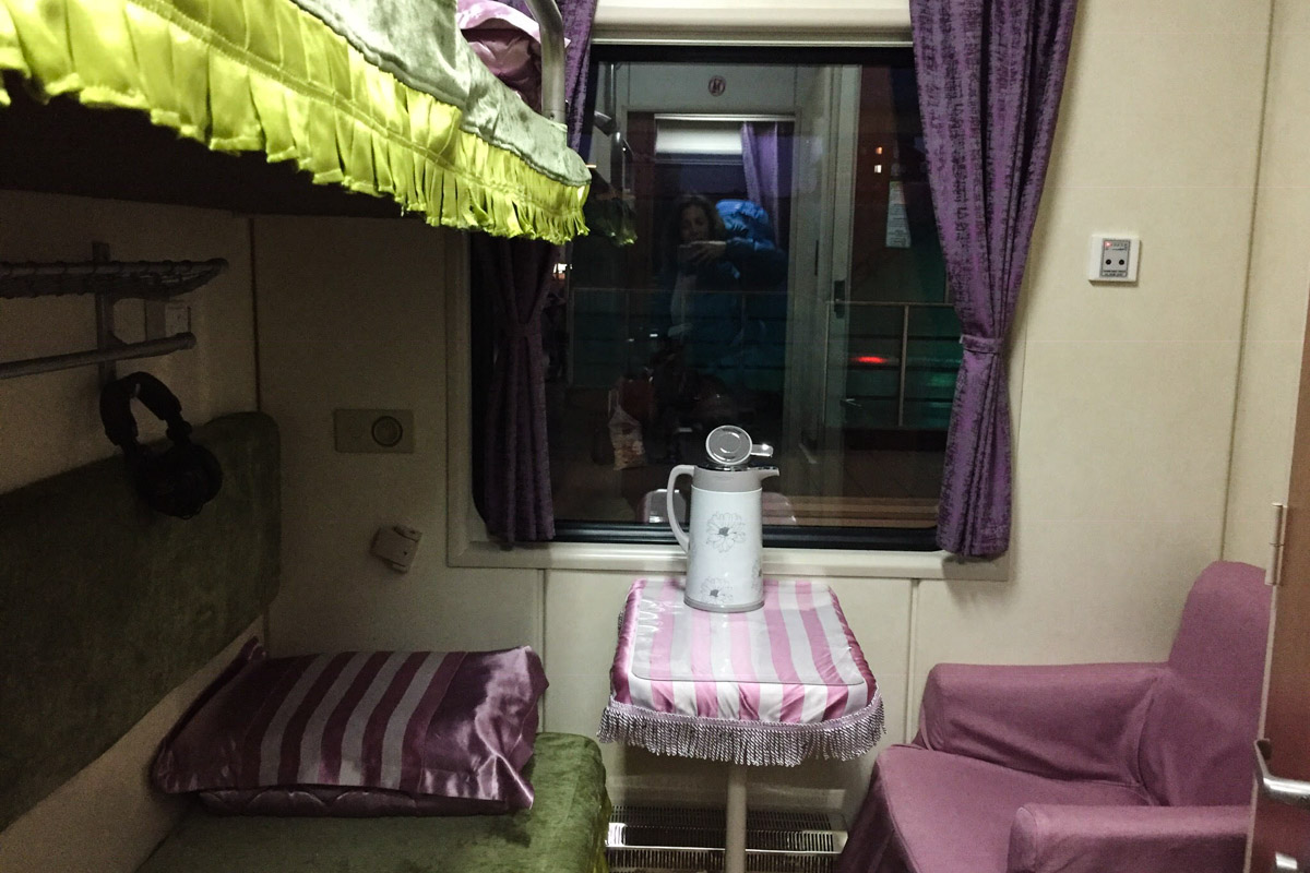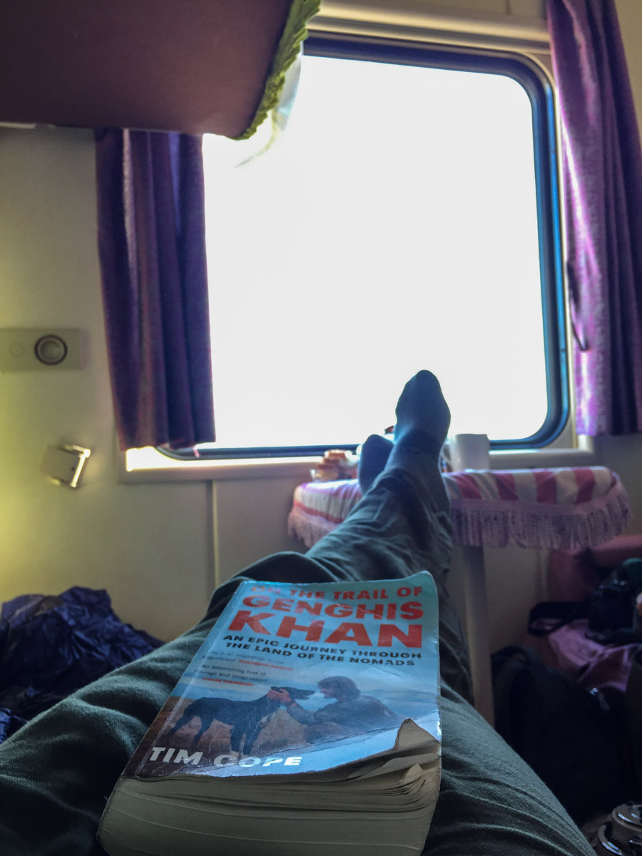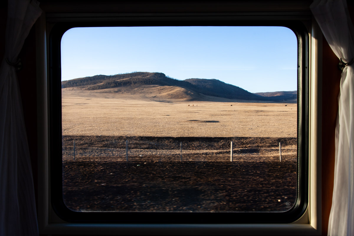 Après avoir passé presque un mois à partager nos yourtes et autres tipis avec des familles entières, nous avons décidé de nous offrir le luxe de la première classe (au diable l’avarice). Cerise sur le gâteau, en plus d’avoir notre propre compartiment, on se rend compte au départ que notre wagon est totalement vide… le luxe suprême (sans doute l’un des avantages de partir hors saison).