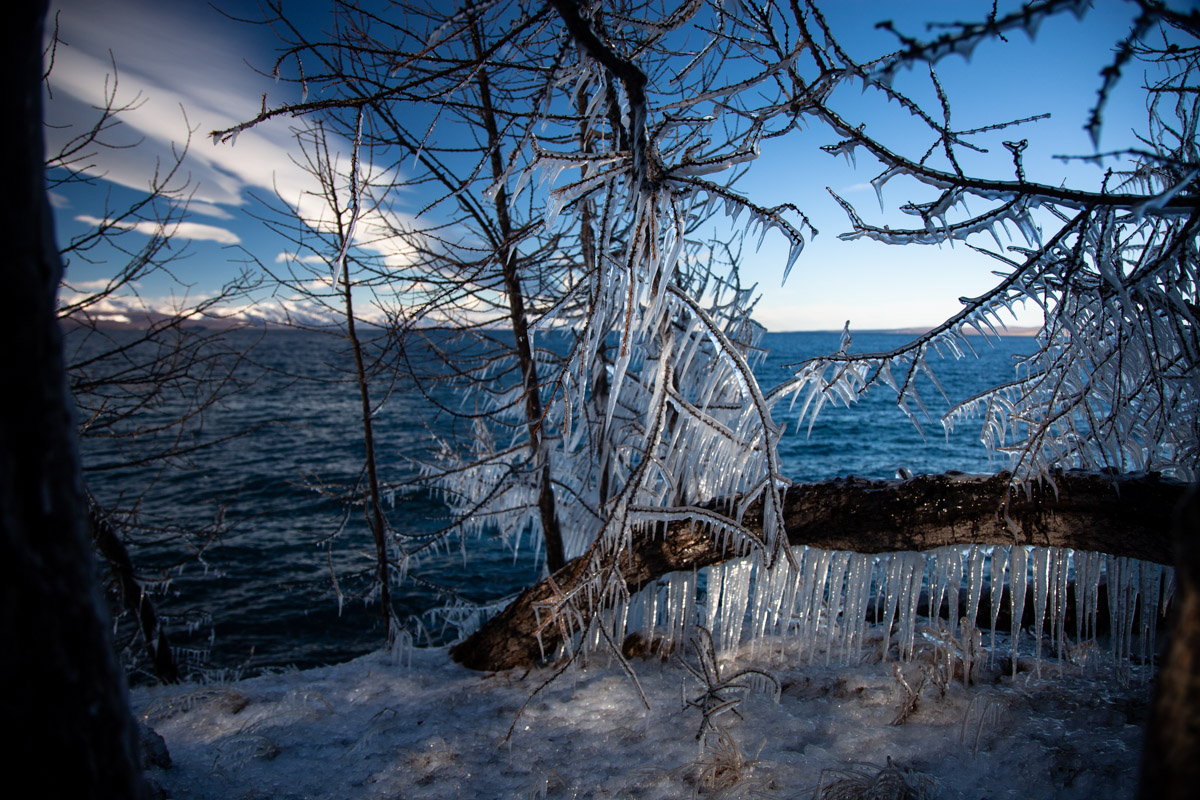 - The snowy banks of the lake.