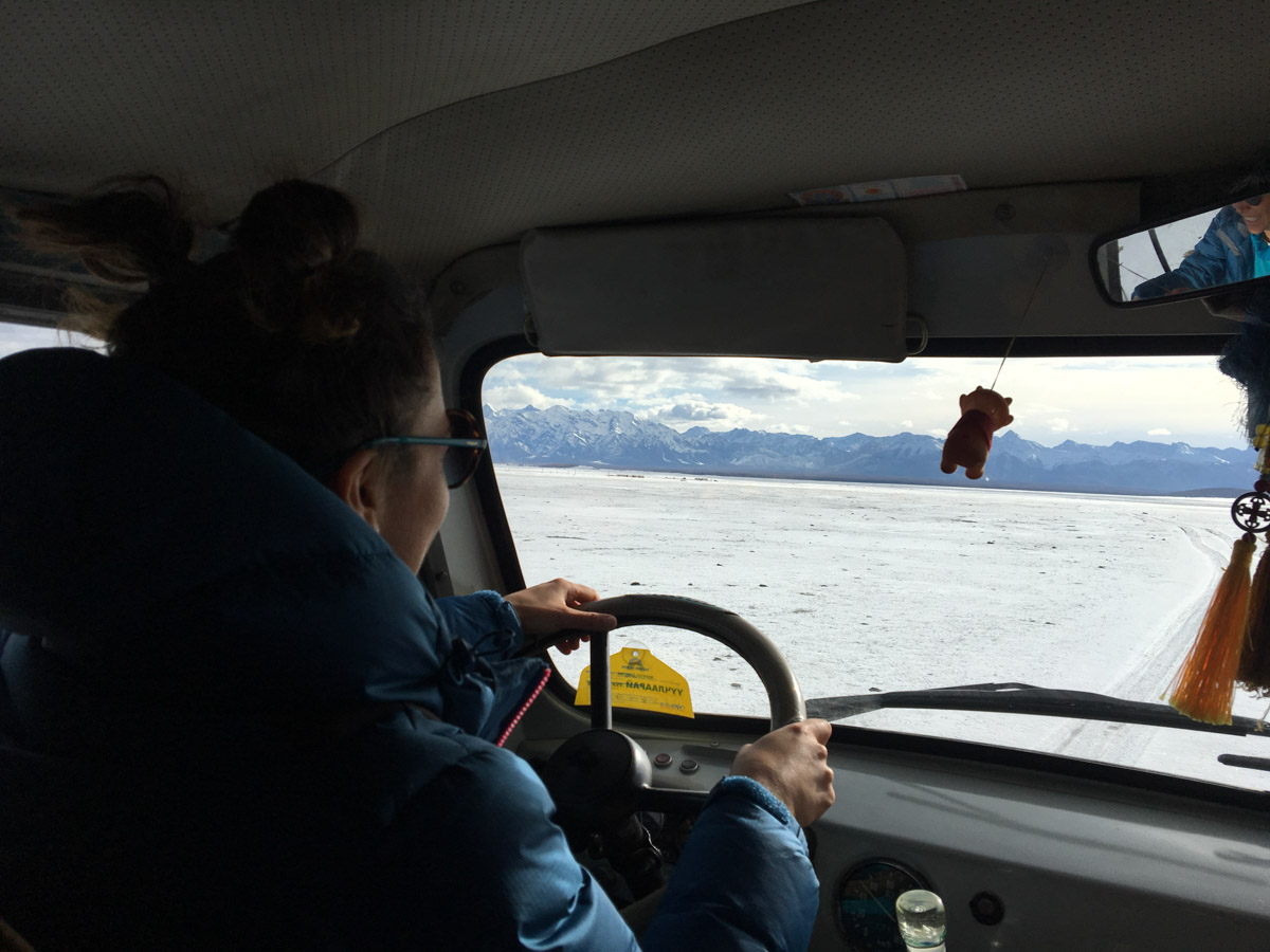 Very hard gearbox, super power steering and pedals that go up to the knee, this Russian animal is not easy to tame. And if you add the 20cm of snow… yes, it is very intimidating. You have to constantly maneuver the car to be able to go few meters straight. After 15 minutes driving I have to say that I respect a lot the Mongolian drivers because driving on this extreme conditions requires a real know-how and thousands of kilometers of experience. Fiorella can not resist either but after 3 minutes she almost destroyed the car so Byamba invited her to sit back again…
