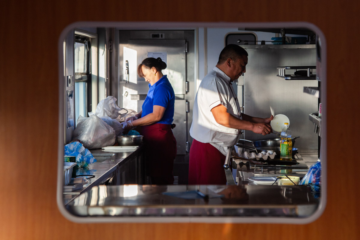 Why so many hours of stop? It is impossible to clearly know what happens behind the scenes during those 4 hours. Some people told us us that it is because when entering China the Chinese police must review the train in detail to check if there are no hidden contraband products or maybe some illegal travellers. They also take out the Mongol wagon from the beautiful pink restaurant (bu…) to put the Chinese restaurant wagon, which really looks like the kitchen of a prison. It is a drastic change.